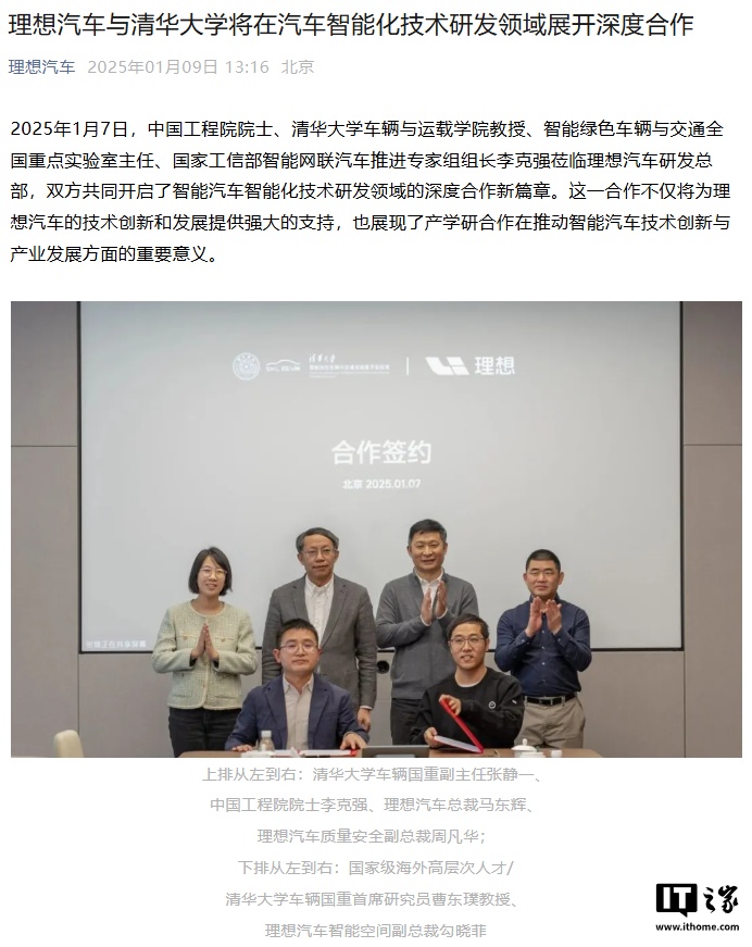 IT之家 1 月 9 日消息,理想汽车今日宣布,2025 年 1 月 7 日,中国工程院院士、清华大学车辆与运载学院教授、智能绿色车辆与交通全国重点实验室主任、国家工信部智能网联汽车推进专家组组长李克强莅临理想汽车研发总部,双方共同开启了智能汽车智能化技术研发领域的深度合作新篇章。